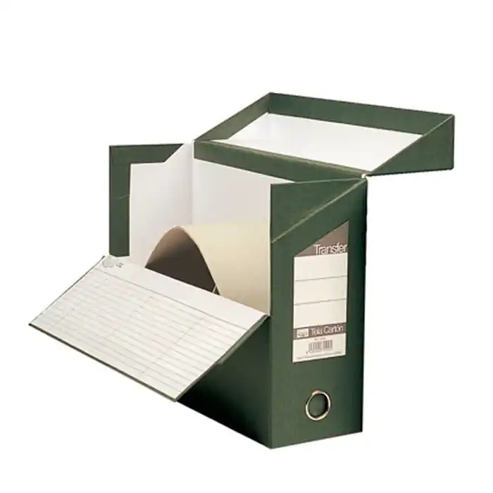 Caja transferencia TF folio. Fabricada en cartón extraduro. Forrada en papel de tela verde. Formato Folio.