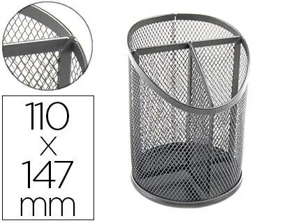 Cubilete redondo de metal de rejilla con 3 compartimentos para clasificar bolÃgrafos, rotuladores o lápices. Medidas: Ã110 x 147 mm. No incluye accesorios.