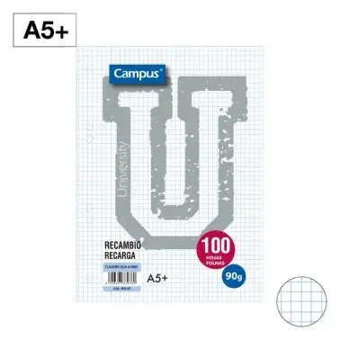 Recambio Campus. Tamaño A5+, medidas: 160 x 220 mm. Contiene 100 hojas de 90 gramos. Con margen. Rayado: cuadrícula de 4 mm. 6 taladros.