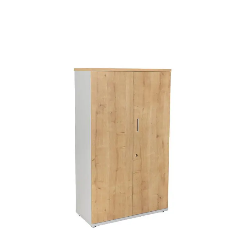 Armario con puertas completas de madera. Estructura fabricada en melamina de 19mm. con cantos de PVC de 1mm. La parte trasera esta fabricada en DM de 3mm. Incluye 4 baldas de 25mm. Armario con almacenaje con puertas batientes. Con sistema de cierre con llave, sistema antivuelco y tiradores metálicos. Admite todo tipo de carpetas gracias a su estructura regulable. Fondo: 45cm. Encaja perfectamente en cualquier espacio de trabajo y en el hogar.