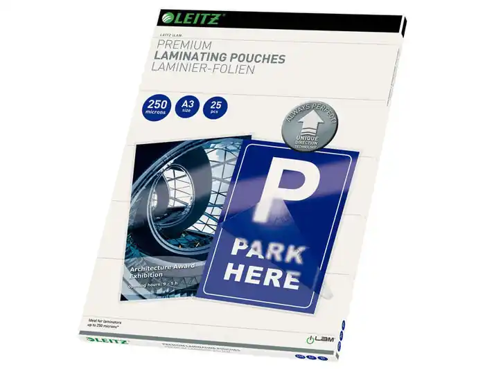Bolsas de plastificación prémium iLAM de Leitz con UDT A3, 250 micras. Sencilla plastificación sin atascos con tecnología de dirección única (UDT). Bolsas de máxima calidad que ofrecen una protección excelente de la suciedad, los líquidos y la humedad. Rigidez sólida.