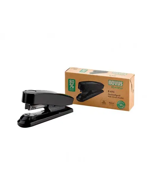 Grapadora fabricada de material reciclado basado en plástico ABS. Para uso diario profesional. Grapadora *Flat-Clinch*, grapado plano. Cargador de apertura frontal con doble guía. Sufridera rotativa para grapado cerrado (permanente), abierto (temporal) y clavado. Incluye 200 grapas. Capacidad de 50 hojas (80 g / m²). Profundidad de inserción máxima en papel es de 60 mm.