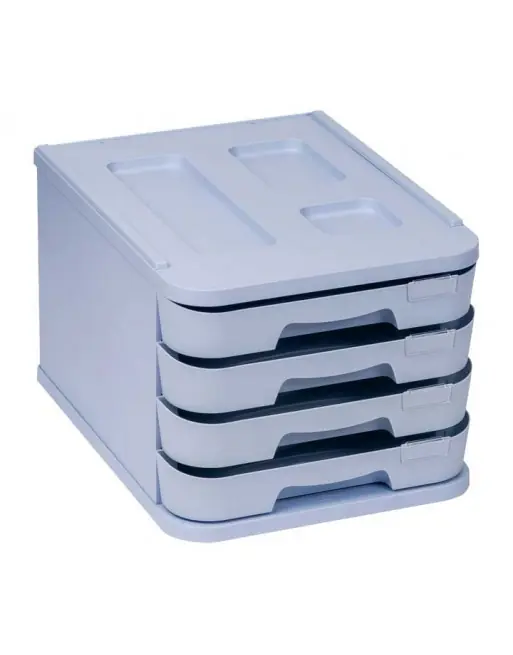 Módulo con cuatro cajones de 5cm para guardar documentos, con sistema de bloqueo que evita la salida de los mismos. Fabricado en poliestireno. Con portaetiquetas en cada cajón. Diseñado para poder apilarse de forma vertical formando un sólido bloque. Color pastel. Medidas exteriores: 28,5×37,5x23cm.