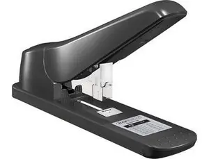 Grapadora metálica de calidad superior y carga frontal. Con pivote central para un esfuerzo mÃnimo de grapado. Ideal para trabajos exigentes. Fácil botón de recarga y capacidad para 210 hojas de 80 g/m². Usa grapas 923/8-23 mm. Ajuste de profundidad: 7-62 mm. Color negro. Medidas: 390 x 75 x 249 mm.