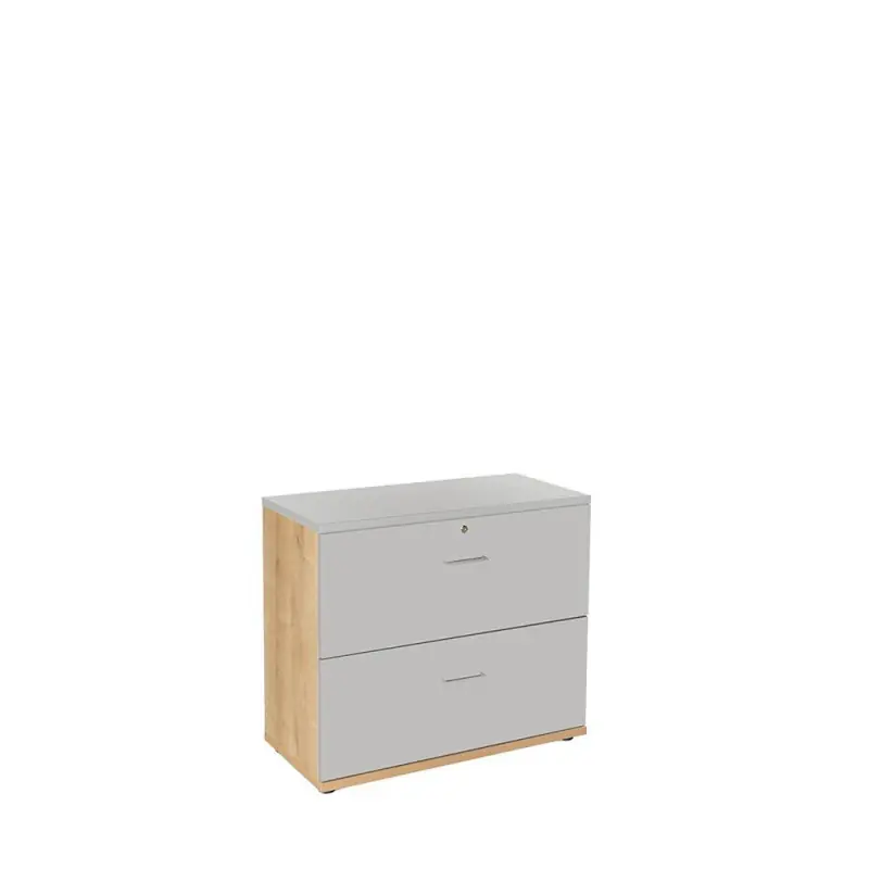 Armario de madera de líneas rectas. Estructura fabricada en melamina de 19mm. con cantos de PVC de 1mm. La parte trasera esta fabricada en DM de 3mm. Incluye baldas de 25mm. Armario carpetero con sistema de cierre, sistema antivuelco y tiradores metálicos. Admite todo tipo de carpetas gracias a su estructura regulable. Fondo: 45cm. Encaja perfectamente en cualquier espacio de trabajo y en el hogar. * El armario de medidas 78x90cm. solo contiene dos cajones carpeteros.
