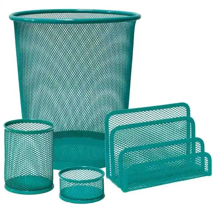 Set de 4 piezas para escritorio: papelera 9 litros, portacartas 3 compartimentos 14,7 x 10 cm, cubilete 8 x 10 cm y portaclips 8 x 4 cm. Color: turquesa.