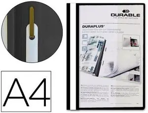 Dossier Duraplus® Durable. Fabricada en plástico, con fástener metálico con cierre de plástico, cubierta transparente y trasera opaca. Ventana con tira de papel en el lomo para personalizar el trabajo. Formato DIN A4. Tapa de 120 micras. Contratapa de 180 micras.