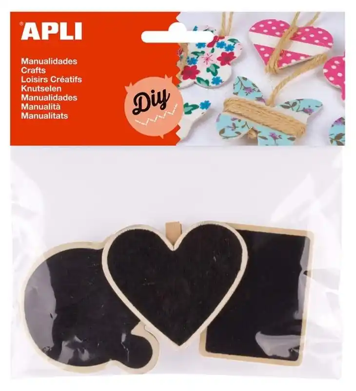 Pinzas de madera con formas en acabado pizarra de tamaño 60 mm (aproximado según forma). Formas: oso, corazón y rectángulo. Cada bolsa contiene 3 pinzas (1 por modelo). Ideales para decorar y sujetar tarjetas, fotos, felicitaciones, regalos, bolsas, postales, notas, crear guirnaldas… y poder escribir tus mensajes al mismo tiempo. Úsalas para dar un toque especial con tus mensajes en casa, la escuela, fiestas, bodas, bautizos, etc.