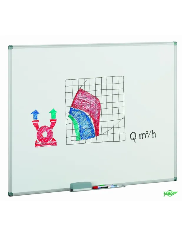 Pizarra blanca con marco de aluminio y cantoneras decorativas.