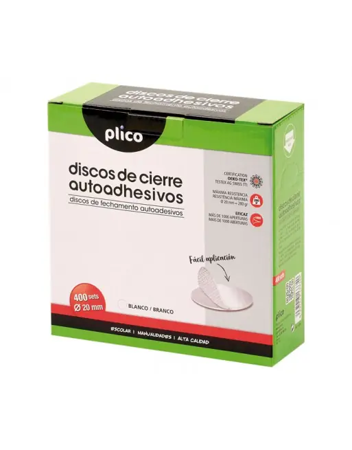 Discos de cierre autoadhesivos de 20mm de diámetro. Se pueden abrir y cerrar más de 1000 veces. Resiste pesos de hasta 280gr por disco. Adhesivo de fácil aplicación. Con homologación OEKO-TEX. Ideal para el hogar y las manualidades escolares. Caja con 400 conjuntos.