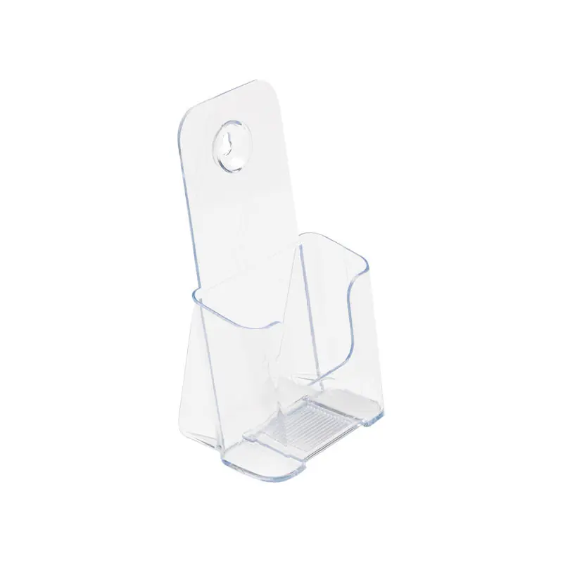 Está fabricado en poliestireno transparente y cuenta con un solo compartimento para tener sus revistas, catálogos ordenados ya sea colgados o encima de la mesa. El formato es de 1/3 A4, lo que le permite guardar y mostrar sus documentos de forma eficiente.