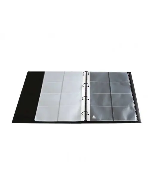 Tarjetero de cubiertas fabricas en PVC de alta calidad. Mecanismo de 4 anillas mixtas de 30mm. Incluye 20 fundas de polipropileno para tarjetas de visita, con 8 compartimentos por funda. Capacidad total de 320 tarjetas de formato 100x70mm. Contiene 12 separadores A-Z de polipropileno negro. Formato A4.