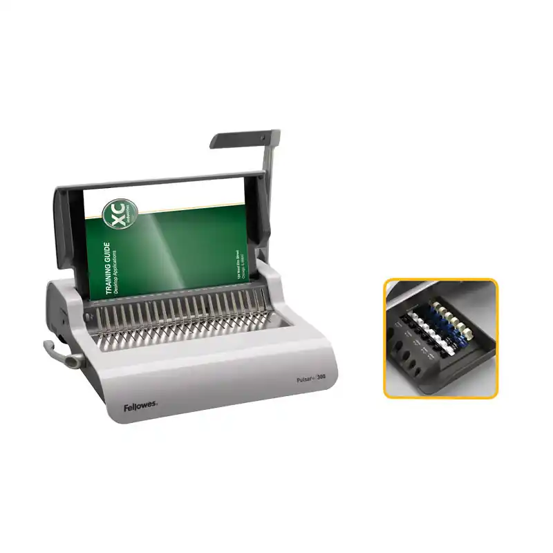 ¡La encuadernadora Fellowes Pulsar+ 300 es la herramienta perfecta para necesidades de encuadernado frecuentes en pequeñas empresas! Esta encuadernadora de uso frecuente es capaz de perforar hasta 20 hojas A4 de 80 gr de espesor, y encuadernar hasta 300 hojas de 80 gr con un canutillo de 38mm.