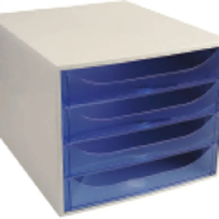 Caja individual con 4 cajones al formato A4+, con stop de seguridad. Dimensiones: 348 x 284 x 290 mm. Color: gris / azul hielo traslúcido.