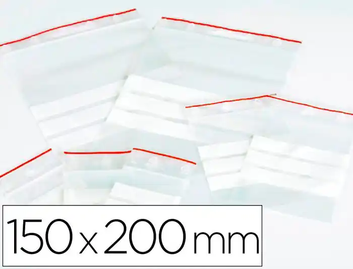 Bolsas fabricadas en plástico con sistema de autocierre por presión fáciles de volver a sellar. Color transparente con una lÃnea roja y una perforación de 6 mm sobre el sello. Ideales para almacenar pequeños suministros de oficina o incluso alimentos. Grosor: 50 micras.