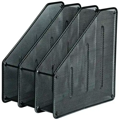 Revistero de malla metálica con tres secciones, para documentos en formato A4.