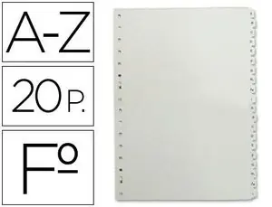 Índice alfabético de 20 pestañas. Fabricado en PVC. 100 micras. Color gris. Multitaladro. Para la clasificación y ordenación alfabética.