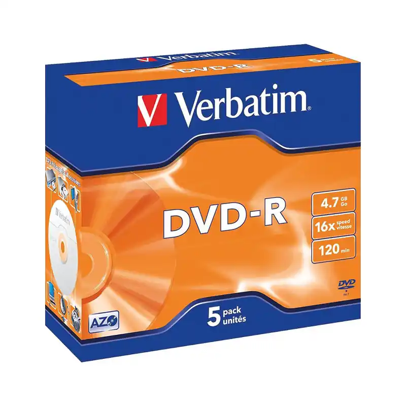 Cada unidad del pack de 5 DVD-R Verbatim 16x de 4.7GB Advanced AZO es un disco grabable, lo que significa que podrás grabar todo lo que desees en él. Estos discos se caracterizan por su mayor capacidad de almacenamiento que los CD-R, los cuales tienen una capacidad de 700 MB como estándar.