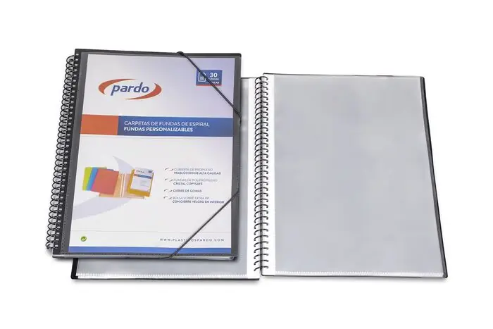 Carpeta espiral 20 fundas con tapas personalizables. Con fundas interiores cristal 90 micras y sobre. Cierre de gomas. Color negro.