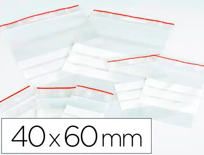 Bolsas fabricadas en plástico con sistema de autocierre por presión fáciles de volver a sellar. Color transparente con una lÃnea roja y una perforación de 6 mm sobre el sello. Ideales para almacenar pequeños suministros de oficina o incluso alimentos. Grosor: 50 micras.