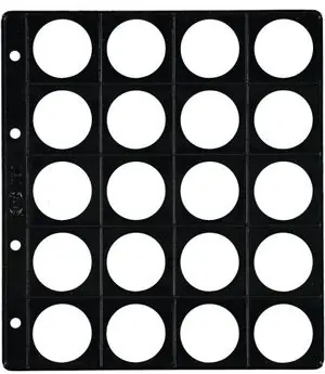 Fundas de plástico transparente con alma opaca negra. Una ranura en la parte superior permite introducir cada moneda en su alojamiento. Con cartulina separadora.