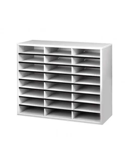 Mueble organizador para documentos o correo. Resistente armario construido de melamina con compartimentos fabricados en cartón ondulado. Cuenta con 24 compartimentos horizontales formato A4. Con mínimo ensamblaje. Dimensiones aproximadas del producto 595x737x302mm. Tamaño del compartimiento horizontal: 225x60x300mm.