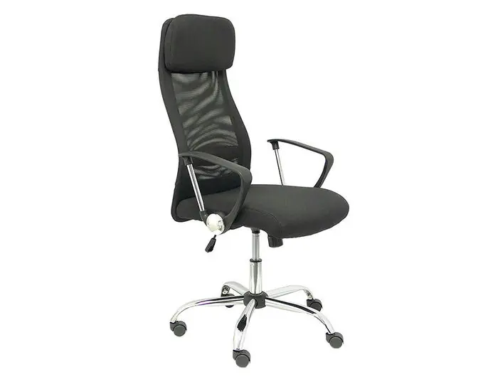 Silla de dirección ergonómica con mecanismo basculante, brazos fijos y regulable en altura. Respaldo de malla transpirable con cabecero y asiento t apizado en tela color negro.