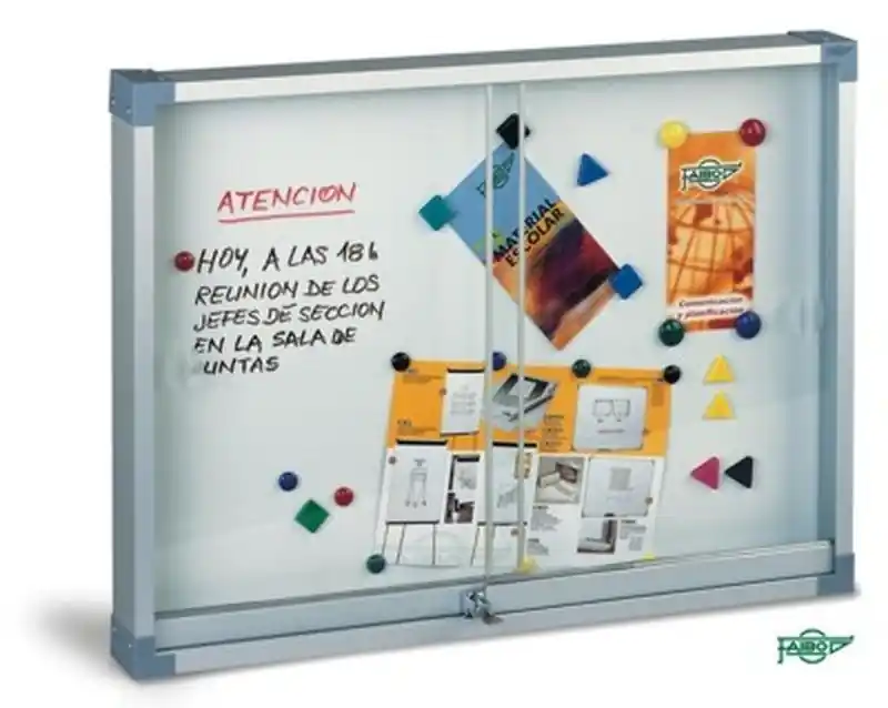 Garantía de la superficie 10 años. De sólida estructura en aluminio anodizado y cantoneras decorativas. Puertas correderas mediante mecanismo deslizante de rodamientos. Suministradas con los elementos de fijación. Cerradura con llave. Superficie metálica blanca, útil para el trabajo con imanes y figuras magnéticas. Permite la escritura con rotuladores especiales para pizarra blanca. Caja individual.